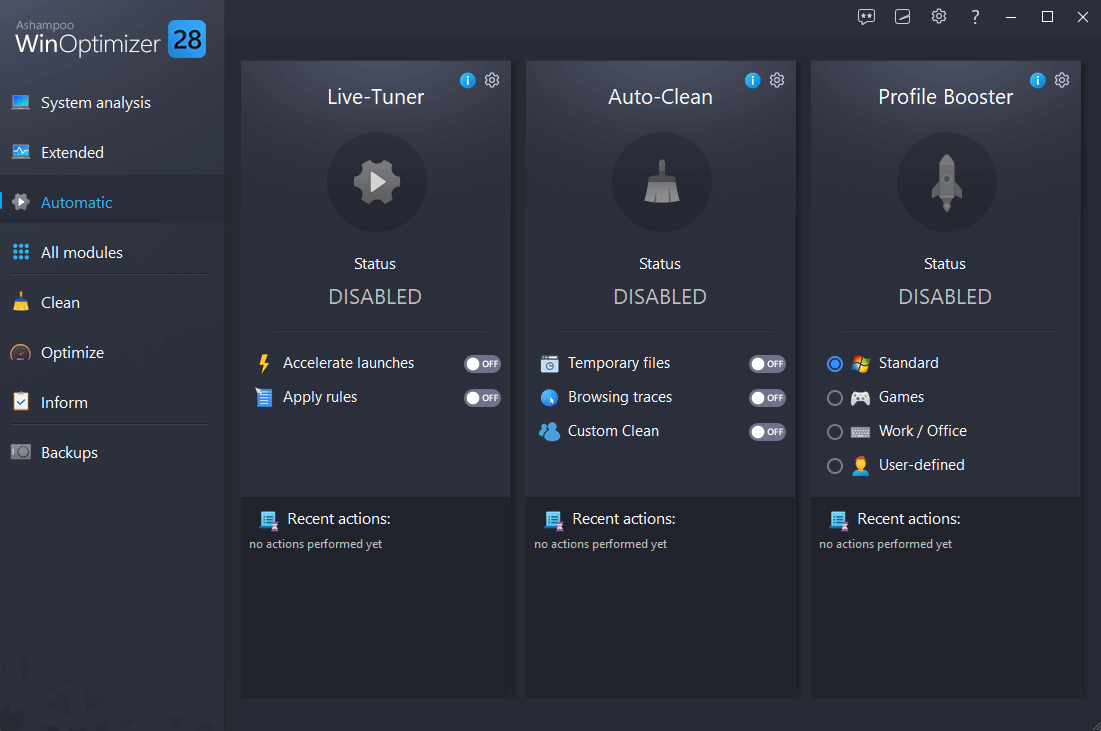 Con el nuevo Ashampoo WinOptimizer 28, obtendrás automáticamente la mejor experiencia de Windows. Su nueva automatización acelera, limpia y ajusta tus aplicaciones. Haz que tu PC se adapte perfectamente a tus necesidades con la priorización de procesos, la limpieza automática de archivos temporales y las configuraciones de perfil personalizadas basadas en el nuevo Profile Booster. Ya sea para jugar, trabajar o navegar, maximiza el rendimiento de tu sistema o conserva recursos, la elección es tuya. El nuevo Analizador de fallos ofrece una visión profunda de los fallos del sistema y sus causas, mientras que cuatro limpiadores avanzados garantizan la privacidad y proporcionan mantenimiento del sistema. Gracias a la gestión mejorada de la memoria, WinOptimizer ahora puede utilizar más recursos para realizar análisis exhaustivos casi al instante.